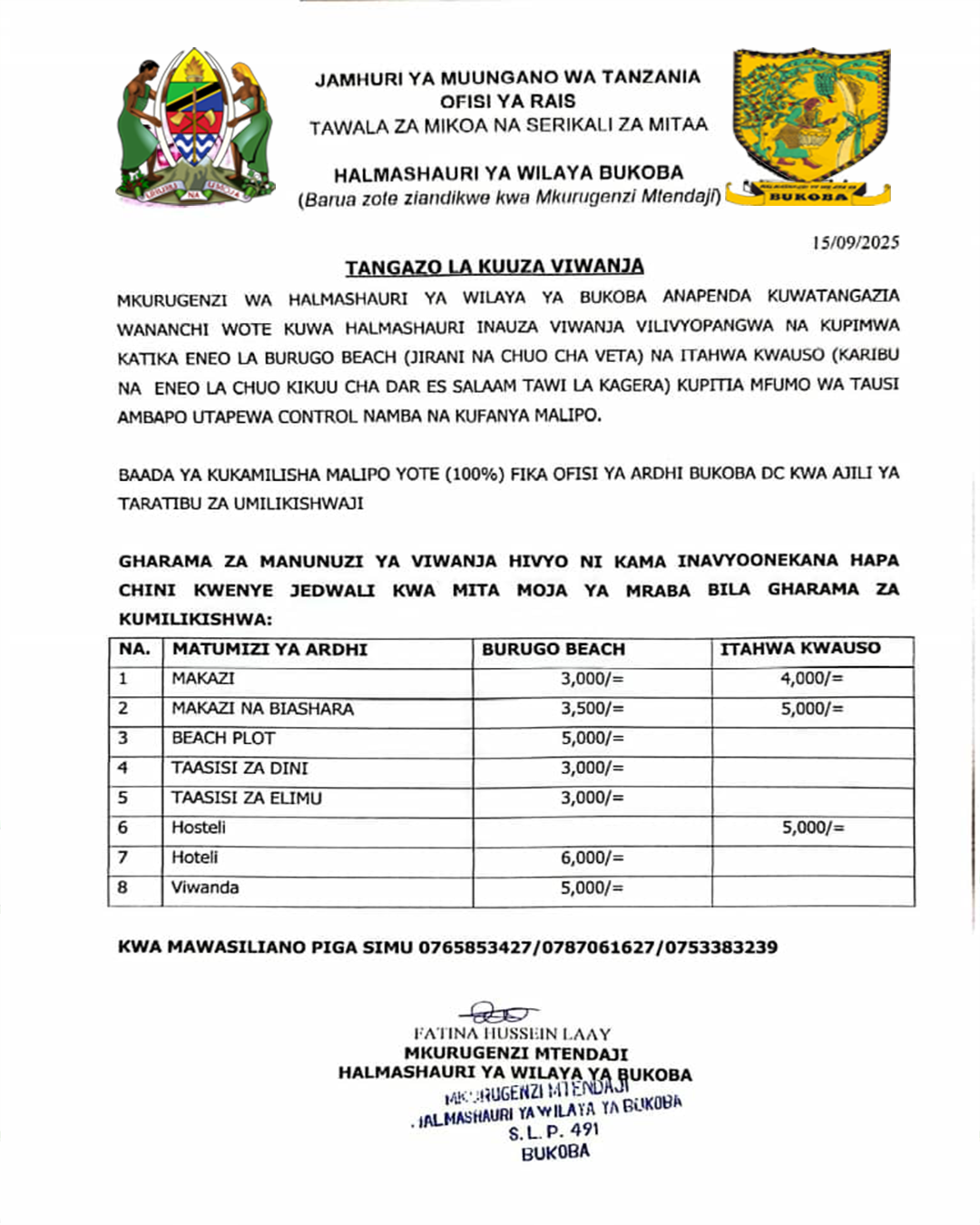 BUKOBA DC KUUZA VIWANJA VILIVYOPIMWA